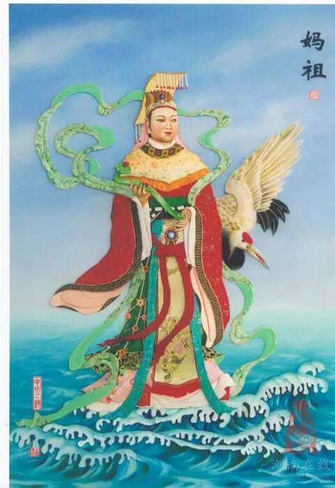有一次妈祖在泉州,忽听到海中有人呼救,有小孩不慎落水。身边没有舟楫,只见妈祖将一条竹席子往海面上一铺,在风浪中如履平地,她“乘席渡海”去救人。