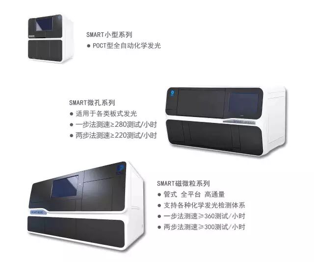 科斯迈作为国内全自动化学发光免疫分析仪专业制造商,拥有全系列完全自主知识产权的各类产品,分别是SMART小型系列、SMART微孔系列、SMART磁微粒系列。