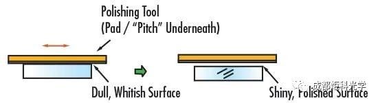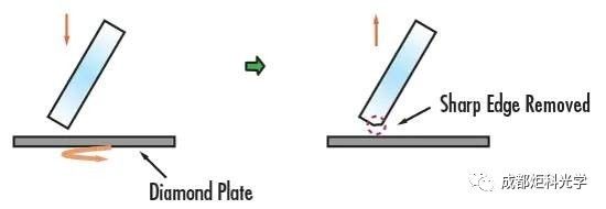 首先,取得一块符合特定等级和玻璃类型的玻璃(称为“玻璃毛坯”)。然后磨砂这块玻璃,或通过一个金属金刚石砂轮生成接近完成的产品。大多数的玻璃都会从这个阶段去除,形成平坦但仍然粗糙的表面(图2a)。此时,即将成为棱镜的尺寸已非常接近所需的规格。接着,是去除表面的表面下裂痕的细磨过程;这一阶段称为精磨。第一个阶段遗留的刮痕将会在第二个阶段中去除(图2b)。精磨处理之后,玻璃表面应出现混浊和不透明。在首两个阶段中,棱镜表面必须潮湿,以便加快玻璃移除和防止玻璃本身过热。