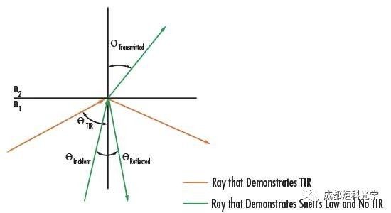 其中n1是光线产生时媒介的折射率,n2是光线出射时媒介的折射率。重要的是,需要知道TIR只有当光从高指数媒介传输到低指数媒介时发生。