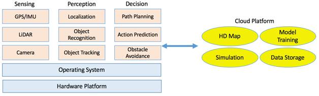 无人驾驶是一个复杂的系统,如图1所示,系统主要由三部分组成:算法端、Client端和云端。其中算法端包括面向传感、感知和决策等关键步骤的算法;Client端包括机器人操作系统以及硬件平台;云端则包括数据存储、模拟、高精度地图绘制以及深度学习模型训练。