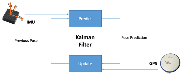 GPS以较低的更新频率提供相对准确的位置信息;IMU则以较高的更新频率提供准确性偏低的位置信息。我们可使用卡尔曼滤波来整合两类数据各自的优势,合并提供准确且实时的位置信息更新。如图2所示,IMU每5ms更新一次,但是期间误差不断累积精度不断降低。所幸的是,每100ms可以得到一次GPS数据更新,以帮助我们校正IMU积累的误差。因此,我们最终可以获得实时并准确的位置信息。然而,我们不能仅仅依靠这样的数据组合以完成定位工作。原因有三:其一,这样的定位精度仅在一米之内;其二,GPS信号有着天然的多路径问题将引入噪声干扰;其三,GPS必须在非封闭的环境下工作,因此在诸如隧道等场景中GPS都不适用。