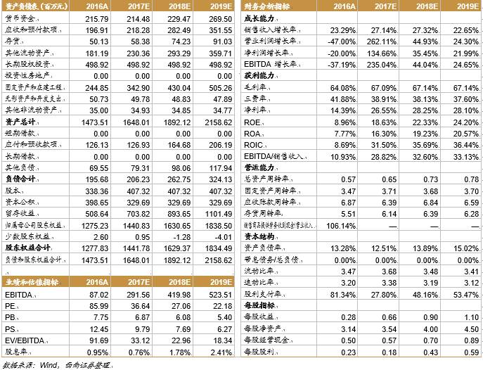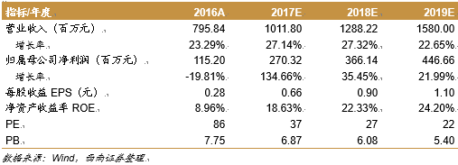 2017年迎来业绩拐点。1)公司于2015年进行销售渠道整顿,2015年销售人员数量同比增长58%,由此带来销售费用率大幅提升约9个百分点,2017年以来销售人员数趋于稳定,前期新增的销售人员亦将进入业绩贡献期,预计销售费用率将恢复至28%左右;2)公司于2014年开始启动海外并购,2015-2016年每年花费中介费用约2000万元,目前并购项目已基本完成,预计2018年开始不再产生相应中介费用;3)公司参股的Trividia与PTS受产品升级换代及费用计提影响,2016年亏损,导致公司投资收益亏损约9000万元,2017年Trividia亏损幅度收窄、PTS已正常盈利,公司投资收益的亏损亦将相应减少。