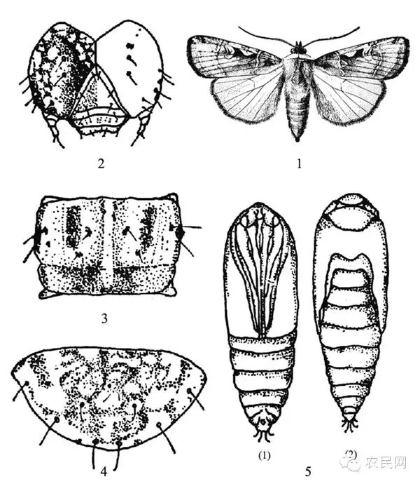 1.成虫 2.幼虫头部 3.幼虫第4腹节背面 4.幼虫臀板 5.蛹(1)正面(2)背面