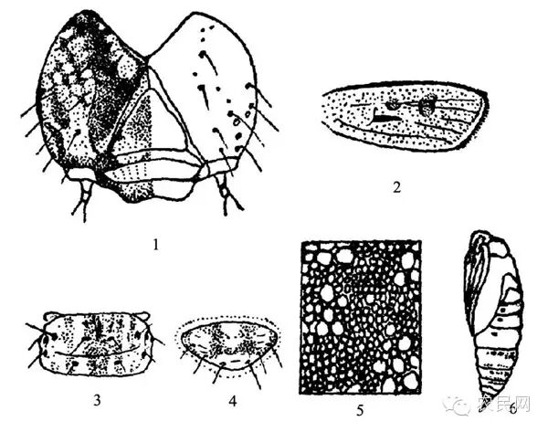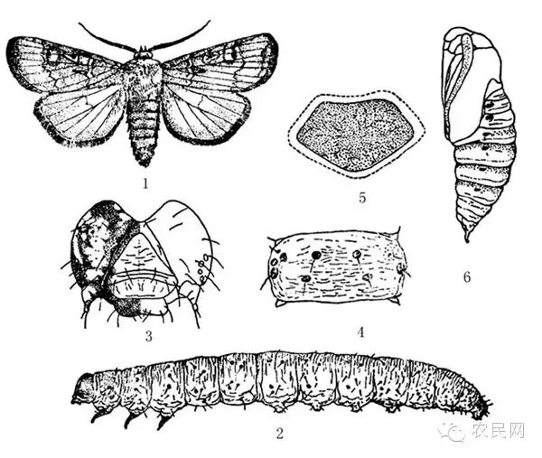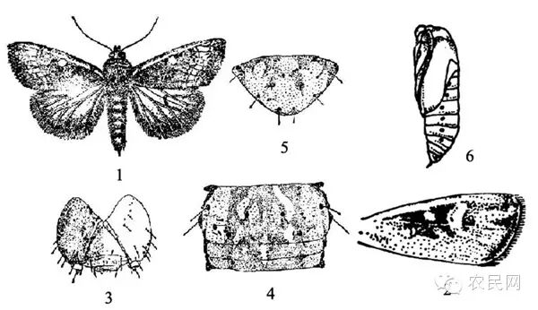 1.幼虫头部 2.前翅 3.第4腹节背面 4.臀板 5.表皮外观 6.蛹(仿魏鸿钧等)