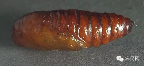 蛹:体长18~20 mm,黄褐色,腹部第3~7节前缘有许多小刻点,末端有1对臀棘。