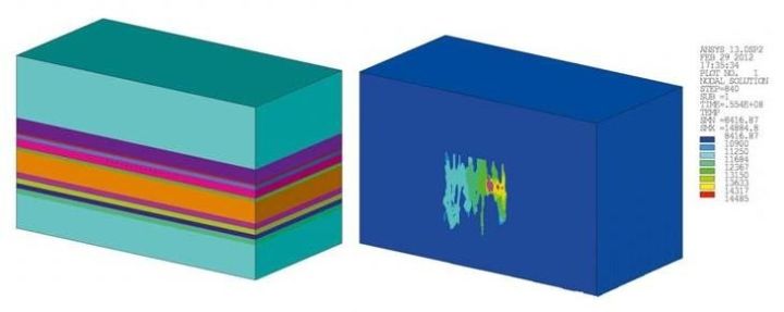 Hydraulic Fracturing Simulator在美国多个页岩气藏中得到了成功应用与验证。图示为德克萨斯州巴内特页岩气藏某气井的水力压裂计算有限元模型。该气藏包括7个岩层,每层包含4组节理。水力压裂设计包括5级压裂,每级的泵注时间为100~200分钟。