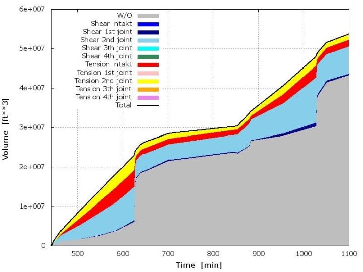改造体积发展历史以及破坏模式,图形显示某页岩气储层以节理的剪切破坏为主导模式