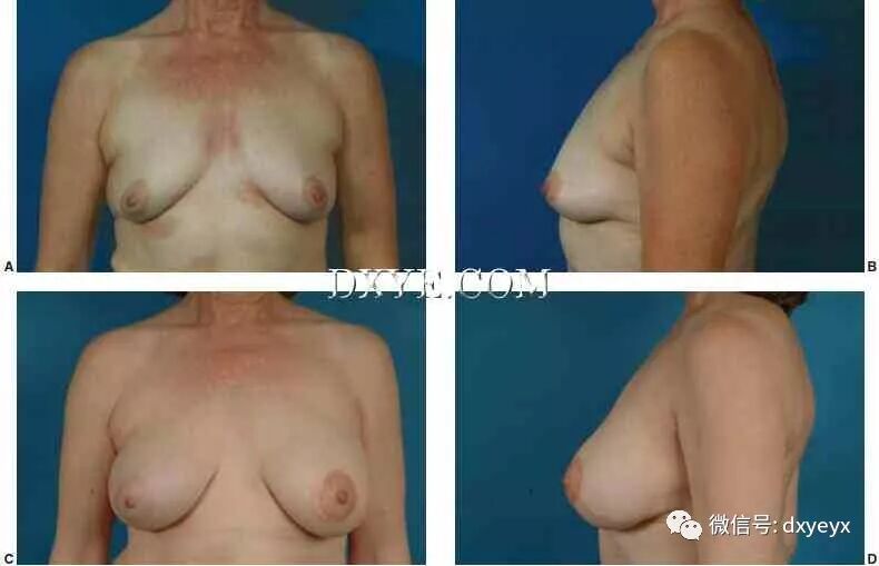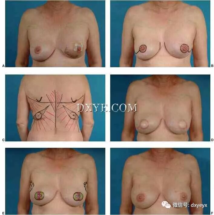 背部标志着圆形皮肤岛,用来替换缺失的和乳晕。椭圆的位置沿松弛的皮肤张力线方向。 D. 在她的1期手术后6个月表现出良好的匀称性和整体美感。