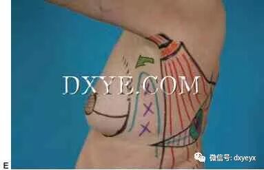在侧视图上,应尊重X标记的粘连区,在皮瓣转移时不应抬高这些组织。相反,最佳的皮瓣通过隧道创建于腋高下降到缺损。这保留了横向轮廓,这是一个里程碑,这是很难创建与内部缝合。