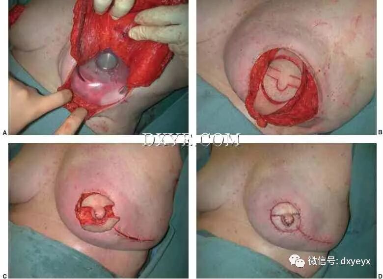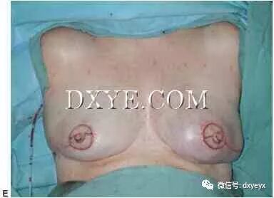 两乳晕半瓣缝合在一起,整个乳晕–构造缝合采用乳晕荷包缝合在缺损。 E.