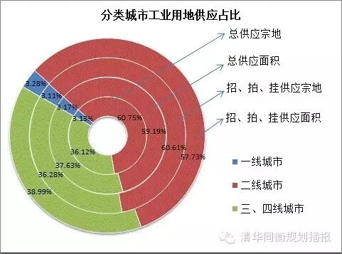一线城市供应工业用地58宗,供应面积223公顷,较上一季度分别增加52.63%和50.12%。其中招标、拍卖、挂牌出让方式供应宗地51宗,较上一季度上升64.52个百分点,供应面积212公顷,环比增长62.48%;二线城市供应工业用地1127宗,供应面积4170公顷,较上一季度分别增加28.51%和19.05%,其中招标、拍卖、挂牌出让方式供应宗地994宗,供应面积3726公顷,较上一季度分别增加23.94和10.89个百分点;三、四线城市供应工业用地670宗,供应面积2651公顷,较上一季度分别降低9.95个百分点和13.08个百分点,其中招标、拍卖、挂牌出让方式供应宗地595宗,供应面积为2516公顷,较上一季度分别减少7.03和11.28个百分点。一、二城市的工业用地供应面积上升幅度较大,三、四线城市均有所下降。