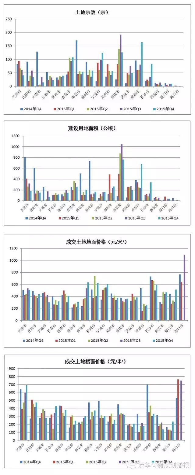 总体来看,2015年第四季度,各类城市成交量呈现不同程度的上升态势;一线城市成交地价变化幅度较大,出现先下降后上升的趋势,而成交楼面均价水平下降明显;二、三、四线城市的成交地价和楼面价都基本持平。(组图3)