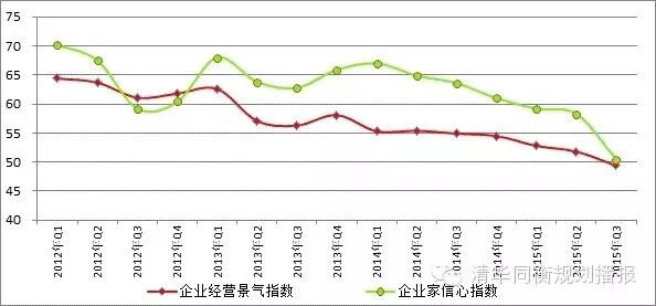 从企业景气情况来看,从2015年第一季度到第三季度,企业景气指数和企业家信心指数持续下滑,分别为59.2、58.3、50.5和52.8、51.8、50.5。企业景气指数在较低位波动,反映2015年以来企业生产经营情况持续不景气;在经济整体下行和资本市场财富效应减弱背景下,企业家信心指数年内持续三个季度下滑,则反映企业家在投资经营中对土地、资本、人力等方面的信心不足,对未来收益预期不乐观。预计在2015年四季度到2016年,受宏观经济复苏乏力、产能去化加速、僵尸企业清理、股市下行明显等诸多因素的影响,企业景气指数和信心指数会继续在较低水平波动,两个指数均会维持在50左右,可能向下突破50。