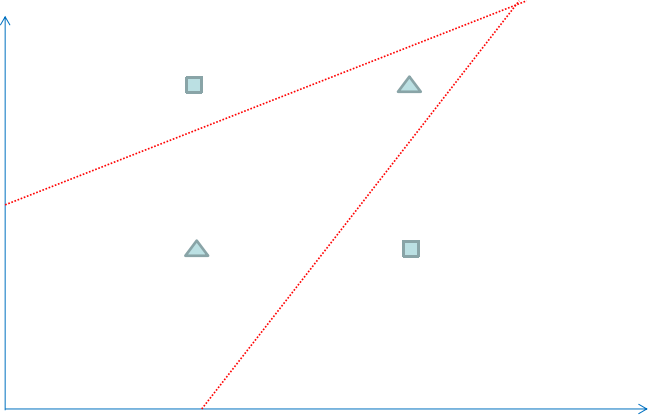 我们可以运用逻辑回归算法来解决上面的分类问题,但是逻辑回归得到一个线性的直线做为分界线,可以看到上面的红线无论怎么摆放,总是有一个样本被错误地划分到不同类型中,所以对于上面的数据,仅仅一条直线不能很正确地划分他们的分类,如果我们运用神经网络算法,可以得到下图的分类效果,相当于多条直线求并集来划分空间,这样准确性更高。