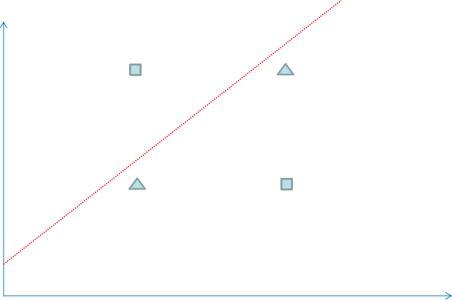 最后我们找个简单例子来看看神经网络神奇的效果。为了方便观察数据分布,我们选用一个二维坐标的数据,下面共有4个数据,方块代表数据的类型为1,三角代表数据的类型为0,可以看到属于方块类型的数据有(1,2)和(2,1),属于三角类型的数据有(1,1),(2,2),现在问题是需要在平面上将4个数据分成1和0两类,并以此来预测新的数据的类型。