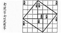 刘徽描述此图为:“勾自乘为朱方,股自乘为青方,令出入相补,各从其类,因就其余不动也,合成弦方之幂。开方除之,即弦也。”其大意为,一个任意直角三角形,以勾宽作红色正方形即朱方,以股长作青色正方形即青方。将朱方、青方两个正方形对齐底边排列,再进行割补—以盈补虚,分割线内不动,线外则“各从其类”,以合成弦的正方形即弦方,弦方开方即为弦长。