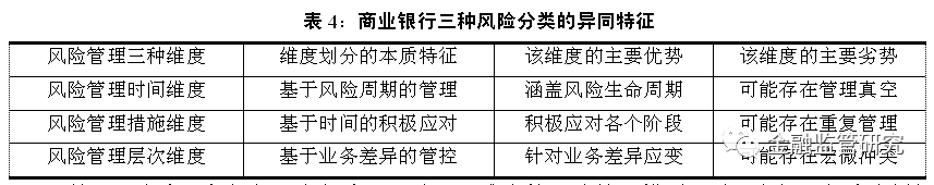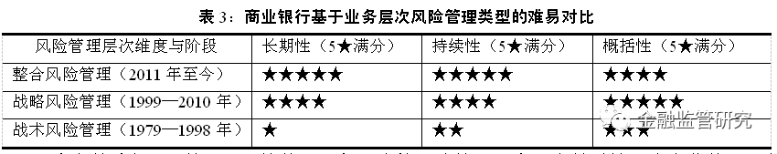 本文结论如下:第一,尽管基于业务层次的风险管理具有一定差异性和应变优势,但也可能存在战略风险管理与战术风险管理的层次冲突。因为,前者更注重长期性、全面性和统一性,是建立在全行所有业务上的统筹和全局之上的,因此,在其具体落实时,可能会与战术性风险管理存在局部与整体、短期与长期、微观与宏观的矛盾。这就需要商业银行的相关部门,特别是战略管理部、风险管理部、内控合规部等风险管理的综合性职能部门统一部署,积极协调,及时发现这类问题和苗头,将其他部门的局部利益统一到全行的全局利益上来,将有关部门的短期视界统一到全行的长期愿景中来,将涉及部门的微观举措统一到全行的长期框架里去。在实现了上述三者统一的基础上,综合性职能部门还需要支持和指导各业务部门在日常的风险管理中避免管理的真空,减少重复的管理举措,降低风险管理的成本,提升风险管理的效率。此外,如果突破三种维度的框架,平等讨论上述九类风险管理类型的特征,可以推导出如下初步结论:一是事前风险管理的效果最好,但也最难度量且最难实现;二是整合风险管理的针对性最强,长期性和持续性最具特色;三是事中风险管理,或者称之为风险控制类型的时效性要求最高,只有确保其控制的及时性,才能保证其管理的有效性。不难看出,上述四类风险管理各具特色,在各自的维度中具有难以替代的作用。