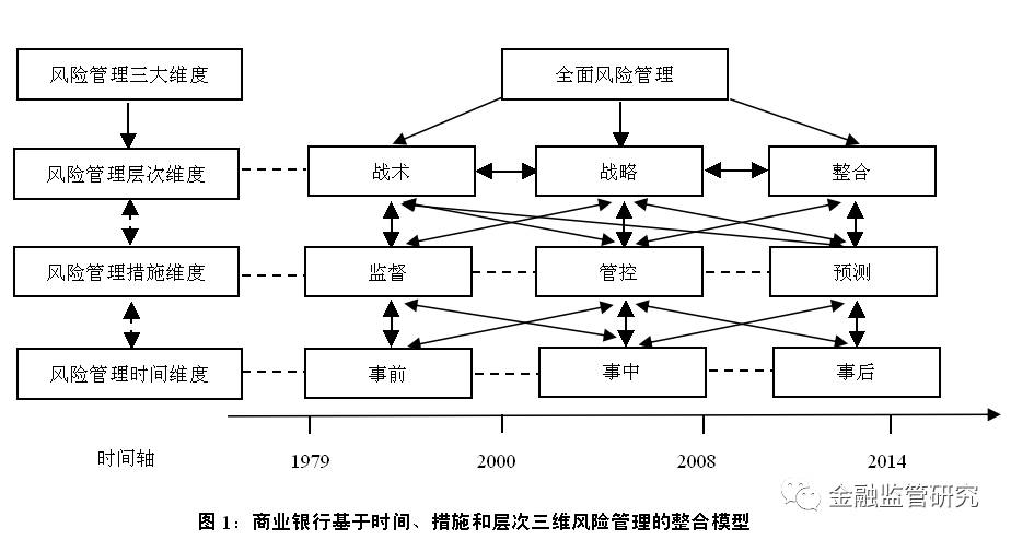 第二,鉴此,本文尝试建立纳入三种不同维度的风险管理模型。图1右侧下部本文设计了时间轴,并根据三类风险划分,标注了代表性的年度时间节点,包括1979、2000、2008和2014年。图1右侧具体展示了基于时间、措施和层次三维风险管理的整合。其中粗线双向箭头表示三维中比较特殊的、具有发展趋向的整合、预测和事前风险管理,实线双向箭头表示其他类型,特别是跨维度类型之间的关系。例如,风险预测不仅可以针对事前的风险管理,也可以针对事中的风险管理;风险管控则包括了事前风险、事中风险和事后风险在内的全生命周期的风险管理;风险监督则主要针对事中风险和事后风险。又如,整合风险管理不仅可以针对风险预测,也可以针对风险管控和风险监督;战略风险管理同样包括了风险预测、管控和监督;战术风险管理则主要关注风险管控和监督的具体措施。需要注意的一点是,除了前文我们提到的方法以及上述风险管控和监督的具体措施,实际并不止于风险的预测、管控和监督。从全面风险管理视角,其具体方法实际包括了各类风险的识别、计量、评估、监测、报告、控制或缓释,风险加总的方法和程序,还包括了风险定性管理和定量管理的方法、风险管理报告、压力测试安排、新产品和重大业务以及机构变更的风险评估、资本和流动性充足情况评估、应急计划和恢复计划,涵盖了风险管理的全过程,从而可以形成全面风险管理的基本体系和方法集合。