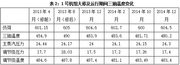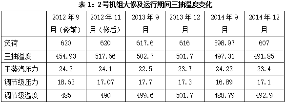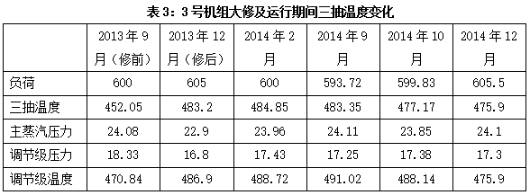 从表1、表2、表3可以看出,机组检修一年后,2号机组三抽温度由517.7度下降至499.7度,共下降了18度,1号机组三抽温度由490度下降至481度,共下降了9度,3号机组三抽温度由482度下降至478度,共下降了4度。