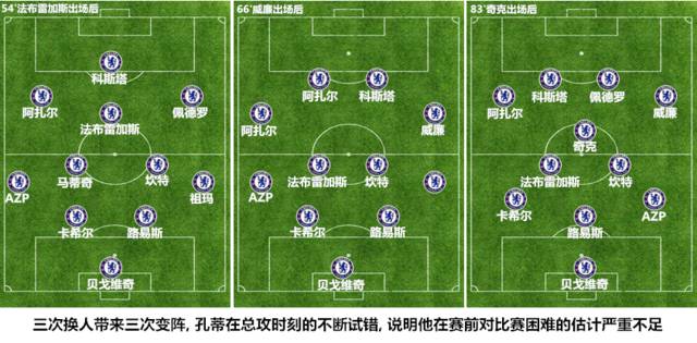 严格意义上来说,蓝军343阵型的中路漏洞在此前对阵曼城的比赛中就已经暴露了出来,瓜迪奥拉在个别位置上的用兵不当吞噬了球队的战术红利,孔蒂没有对胜利掩盖下的问题给予足够的重视,意大利人“以不变应万变”的比赛策略遭到了穆里尼奥的无情拆解。为了增加中路厚度来实现攻守平衡的目标,孔蒂在两球落后的情况下陆续通过三次换人完成了三次变阵,意大利人试图通过制造中场的人数均势来扭转相对被动的局面。