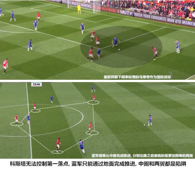 在成功地将蓝军的阵线压制在后场后,曼联着力打击的就是蓝军的左路防区,身材高大、脚下频率稍慢的特点让马蒂奇很难破解压迫,蓝军的左路运输线很容易被对手拦腰斩断。在上半场的大部分时间内,蓝军非但无法攻入禁区甚至都难以越过半场,直到上半时结束之前,孔蒂的球队才完成本场的第一次射门。