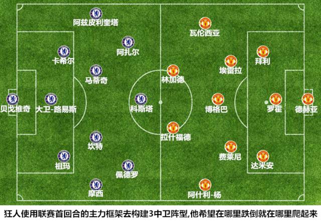 在此前的足总杯交锋中,穆里尼奥排出了一个以加强中路厚度为核心的352阵型,其目的在于遏制深蓝三叉戟的火力,随着多位伤员和停赛球员的回归,狂人已经有了足够多的人手去完善他的战术构想。为了准备周中与安德莱赫特的欧联杯比赛,穆里尼奥轮休了近期体能消耗极大的伊布和姆希塔良,在费莱尼、埃雷拉和博格巴的三中场身前,速度很快的拉什福德和林加德负责冲击蓝军防线核心大卫-路易斯两侧的空当,往返能力极强的阿什利-杨和瓦伦西亚需要完成对边路走廊的覆盖。