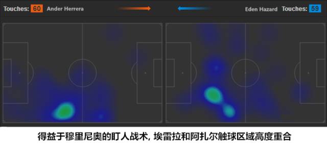 在“兑子”战术取得成功的情况下,穆里尼奥又祭出了可称之为“斩首”的B计划,目标人物是阿扎尔和马蒂奇。由于中场技术含量不足,蓝军的进攻推进主要依靠两名边锋与翼卫之间的联动,在有球能力最强的阿扎尔被埃雷拉兑子的情况下,摩西和阿兹皮利奎塔也无法完成持球推进任务,前者的问题是无法适应相对别扭的逆足位置,后者则被状态火爆的阿什利-杨完全压制。