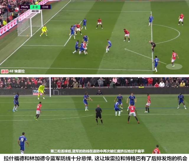 红魔此役的352阵型比蓝军的343更具中路厚度和层次感,林加德和拉什福德在无球状态下向后靠拢中场,配合队友阻塞蓝军由卫线经后腰向前场的前进通道。慑于曼联双前锋的反击威胁,大卫-路易斯很少能够引球向前破解曼联的中圈矩阵,负责后场出球的巴西人只能选择将球分到边路,曼联的三中卫体系中负责两肋区域的是上抢能力很强的达米安和拜利,三中场的扁平化站位便于费莱尼和埃雷拉就近支援边翼卫和边中卫,寡不敌众的坎特和马蒂奇很难完成攻守衔接任务。