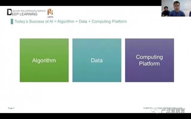 进入知识讲解。姚颂介绍道,现在虽然人工智能是个热门概念,但很多人误以为“人工智能等于深度学习”,但其实人工智能的范围大于机器学习,机器学习的范围又大于深度学习。人工智能由三方面共同组成,算法、数据以及计算平台,这个领域的上升也是三方面技术的共同发展合力造成的。