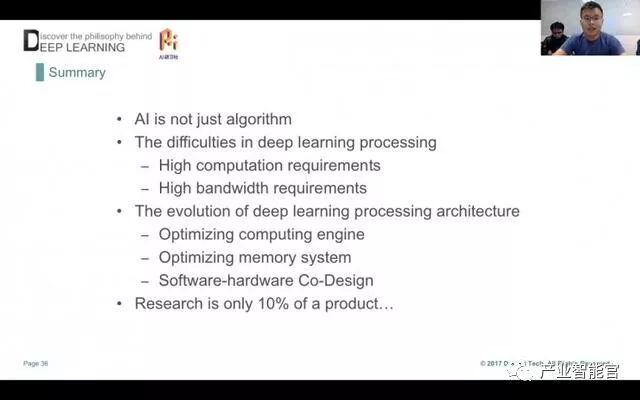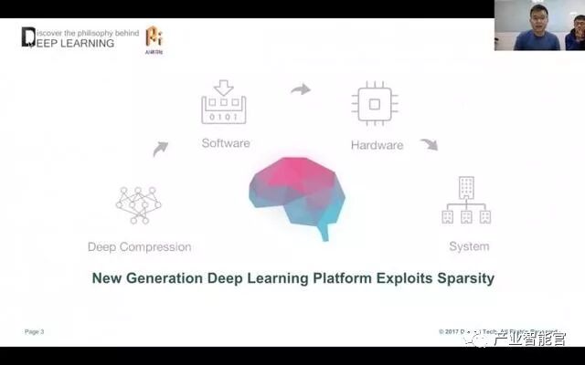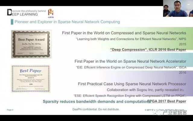 姚颂首先简单介绍了一下深鉴科技。深鉴科技的英文名DeePhi是Deep Learning和Philosophy的结合,这也是他们的slogan“Discover the philosophy behind deep learning” 所传达的。