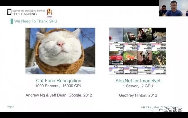 2012年时,Google X启动了“猫脸识别计划”,吴恩达和Jeff Dean用了1000台分布式服务器和一万六千个CPU。同期的AlexNet只需要1台服务器、2个GPU就训练出来了。