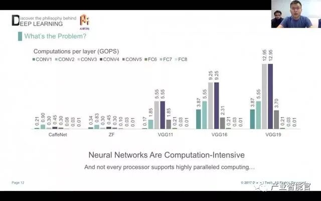 图中是一些较为老旧的神经网络所需的计算量。最新的ResNet50做一次前向的推理就需要7GOPS,。相比之下,手机的ARM处理器的计算能力典型值是10GOPS。所以这样的网络是没办法在手机端运行的,即便只是推理任务。而当前的许多处理器也都没办法支持如此大规模的并行计算。