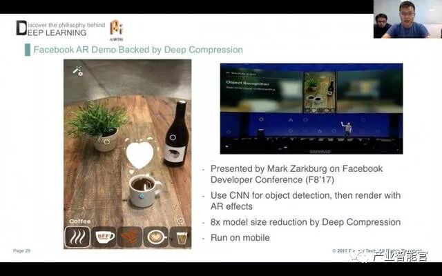 Deep Compression最大的应用是在手机app中,比如AR app中都用Deep Compression把网络压小到手机能够存储、运行的大小,Facebook的AR Demo App就取得了8倍的压缩效果。