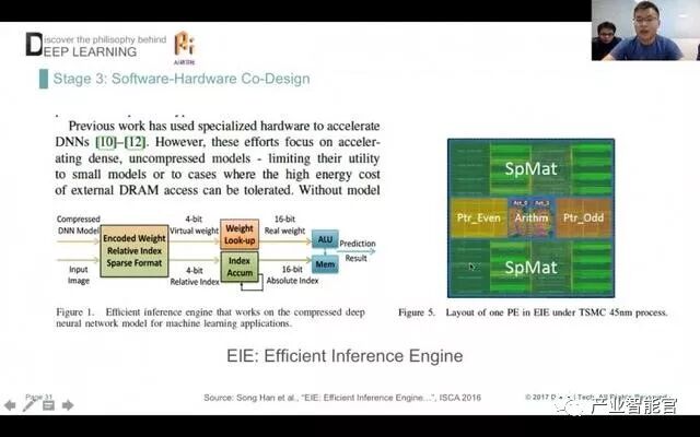 接着大家发现,做完压缩之后的网络不一定能很好地在CPU或者GPU上运行,因为这些硬件适合稠密运算。所以在EIE(Efficient Inference Engine)的工作中设计了压缩后的神经网络专用的处理器架构。