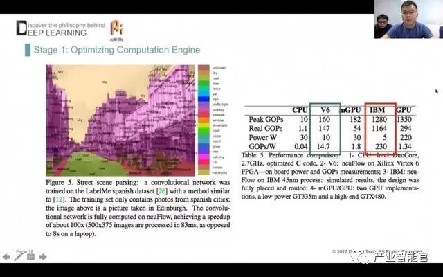 在场景解析的测试中,他们使用了V6 FPGA芯片,得到了非常高的峰值性能(Peak GOPs)同时,也得到了很高的实测性能(Real GOPs)。同期GPU的实测性能要远低于峰值性能。