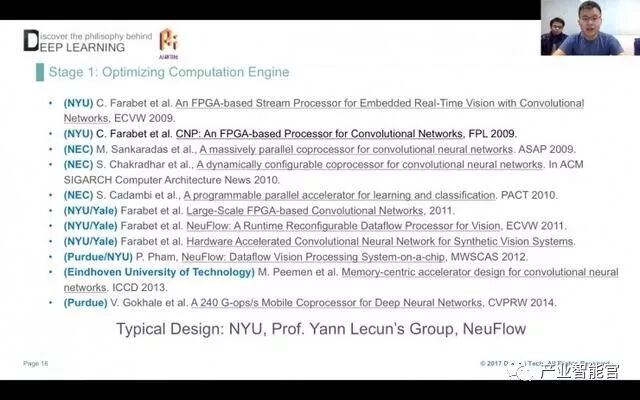 这个阶段的一个典型方案是Yann LeCun小组提出的NeuFlow,设计思路是数据流的处理。他们设计了阵列式、可重构的数据流引擎,阵列中的不同单元同时进行不同的计算,显著提高了计算资源的利用率。
