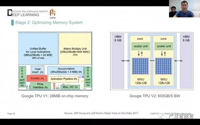 不过这种思路总体还是不错的,在企业级应用中很受欢迎,比如谷歌的TPU就有28MB的片上存储,可以装下整个Inception网络。在只做推理的TPUV1之后,TPUV2为了兼顾训练又增加了许多片外的高带宽存储(HBM)内存,与此对应的成本和功耗也会有一定上升。
