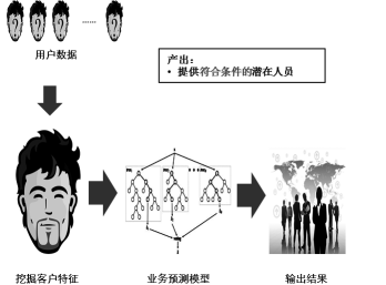 图1是一个典型的推荐类应用,需要找到“符合条件的”潜在人员。要从用户数据中得出这张列表,首先需要挖掘出客户特征,然后选择一个合适的模型来进行预测,最后从用户数据中得出结果。