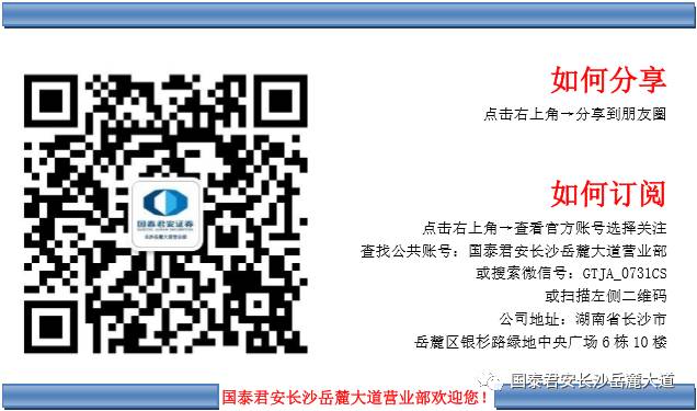 本文仅做交流所用,并不代表本营业部的观点,且不作为投资建议。国泰君安长沙岳麓大道营业部也不对任何人因使用本订阅号所载的任何内容所导致的任何损失承担任何责任。以此投资,风险自负。