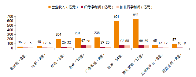 图10:传媒互联网上市公司分行业2017Q1-Q3营收、归母净利润及扣非后净利润分布