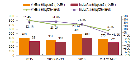 图3:传媒互联网上市公司2015-2017前三季度归母净利润和扣非后净利润总额(亿元)及同比增速