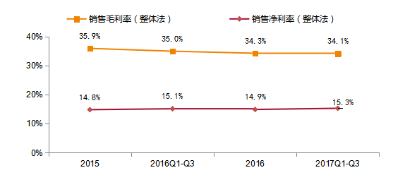 图14:传媒互联网上市公司2015-2017前三季度毛利率、净利率变化(整体法,剔除乐视网和东方明珠)