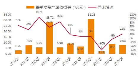 若剔除东方明珠、二三四五和乐视网,2017年前三季度资产减值损失同比下降12%。单季度来看, 2017年Q3确认资产减值损失为8.04亿元,同比增加21%。