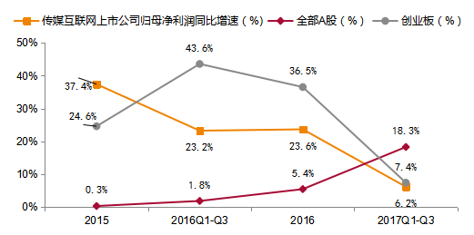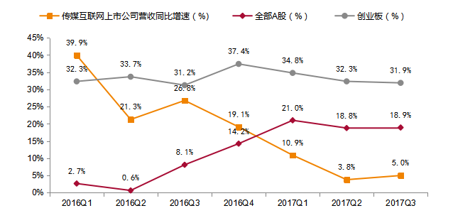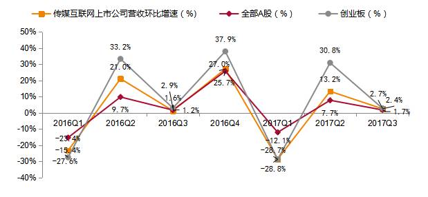 图1:传媒互联网上市公司2015-2017前三季度营收增速对比(整体法)