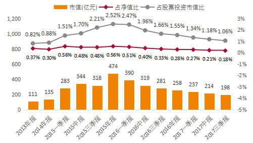 根据基金股票组合行业分布汇总,2017年三季报期,基金文化、体育和娱乐业类别股票持仓市值198亿,占净值比为0.18%,占股票投资市值比为1.06%,三项指标从2016年一季报起逐期下降。