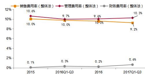图16:传媒互联网上市公司2015-2017前三季度三项费用率变化(整体法,剔除乐视网)