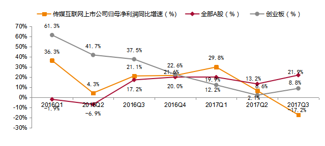 图2:传媒互联网上市公司2015-2017前三季度归母净利润增速对比(整体法)