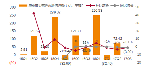 图17:传媒互联网板块2015-2017Q3单季度经营性现金流净额(整体法,剔除乐视网)