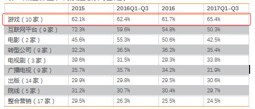 我们按照子行业进行分类统计,选取财务数据完整的共78家公司作为样本,其中电视剧公司3家(慈文传媒、华策影视等)、电影2家(华谊兄弟、光线传媒)、院线5家(万达院线、中国电影等)、游戏10家(完美世界、三七互娱、游族网络、恺英网络、宝通科技等)、广播电视9家(歌华有线、广电网络等)、出版14家(中南传媒、中文传媒等)、整合营销17家(分众传媒、蓝色光标等)、互联网平台9家(东方财富、顺网科技等,由于乐视网17H1业绩波动较大,未加入样本)、另有转型公司9家(北京文化、中南文化等)。